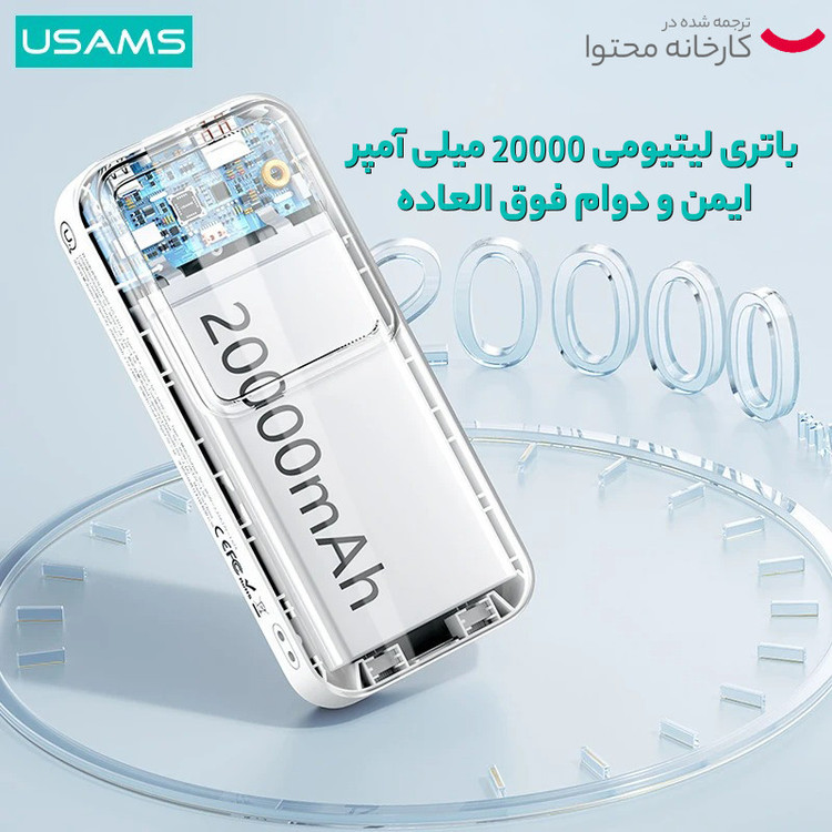 پاوربانک US-CD212 یکی از محبوب ترین و با کیفیت ترین پاوربانکهای یوسمز به شمار میرود. این محصول قابلیت های زیادی به نسبت قیمت آن دارد . داشتن یک کابل لایتنینگ و یک تایپ سی متصل به آن، فست شارژ 20 واتی ، قابلیت شارژ 4 دستگاه به صورت هم زمان و دارای تکنوژی پیشرفته و مخصوص آیفون 14 و 15 است که شما را بینیاز به کابل شارژ میکند. در صورتی که نیاز به حمل مداوم یک پاور بانک دارید این محصول بسیار کاربردی خواهد بود. پاور بانک یوسمز مدل CD212 علاوه بر کابلهای متصل دارای دو خروجی است که یکی از آن ها پورت USB بوده و به شما این امکان را می دهد تا بتوانید گوشی خود را با شدت جریان و ولتاژ 5V-3A, 9V-2A, 12V-1.5A شارژ کنید و دیگر خروجی این پاوربانک پورت تایپ سی است که هم بهعنوان ورودی برای شارژ پاوربانک و هم خروجی استفاده میشود که حداکثر خروجی این پاوربانک 20 وات میباشد. خروجیهای پاور بانک usams مدل CD212 از فناوری فست شارژ PD و QC بهره میبرند و میتوانند گوشی شما را را با سرعت بالا شارژ کند. همچنین پاوربانک یوسمز مجهز به یک چیپست هوشمند است که قادر به محافظت از باتری گوشی شما در برابر نوسانات و اتصالات کوتاه است بهگونهای که شدت جریان خروجی از پاوربانک را با شدت جریان ورودی گوشی شما یکسان میکند تا هیچ گونه آسیبی به باتری گوشی شما وارد نشود. بر روی بدنه پاوربانک فست شارژ usams نمایشگر دیجیتال قرار داده شده که با فشار دادن دکمه پاور مشاهده میشود که میزان شارژ باتری پاوربانک را به شما نشان بدهد.