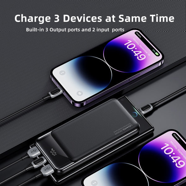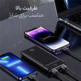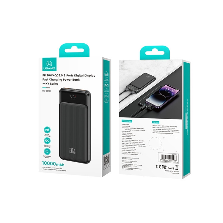پاوربانک 10000 میلی آمپر یوسمز مدل CD197 دارای سه خروجی است که از 2 پورت USB و یک پورت تایپ سی (usb-c) است. پاوربانک یوسمز مدل CD197 دارای دو پورت ورودی بوده که شامل پورت های میکرو و تایپ سی میباشد و باعث شده تا بتوانید به راحتی با تمامی این کابل ها این پاوربانک را شارژ کنید. حداکثر توان خروجی های این پاوربانک 20 وات است که از استانداردهای فست شارژ و فناوری PD و QC بهره میبرند و میتوانند گوشی شما را را با سرعت بالا شارژ کنند. پاوربانک 10000 usams مجهز به یک چیپست هوشمند میباشد که قادر است از باتری گوشی شما در برابر نوسانات و اتصالات کوتاه محافظت کند به گونهای که شدت جریان خروجی از پاوربانک را با شدت جریان ورودی گوشی شما یکسان میکند تا هیچ گونه آسیبی به باتری گوشی شما وارد نشود. شدت جریان و ولتاژ عبوری هر کدام از پورتهای شارژر همراه 10 هزار یوسمز CD197 به شرح زیر است: درگاه های USB (خروجی): 12V/1.67A | 5V/3A | 9V/2.22 درگاه تایپ سی (خروجی): 5V/3A | 9V/2.22A | 12V/1.67A با حداکثر توان خروجی 20 وات میباشد. بر روی بدنه پاوربانک نمایشگر دیجیتال قرار داده شده که با فشار دادن دکمه پاور، قابل مشاهده میباشد که قادر است میزان شارژ باتری پاوربانک را به شما نشان بدهد. بدنه این پاوربانک از پلاستیک باکیفیت + ABS بوده که از مقاومت بالایی در برابر خط و خش و ضربه و حرارت دارد. ابعاد این محصول 147x70x16mm بوده و وزن آن 236 گرم میباشد.