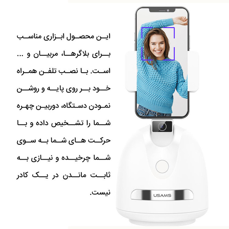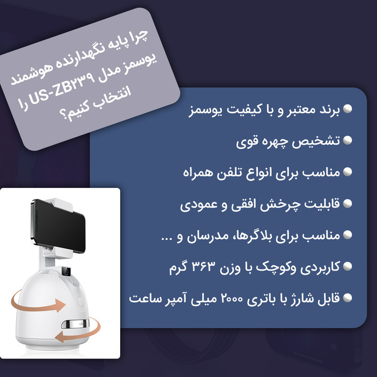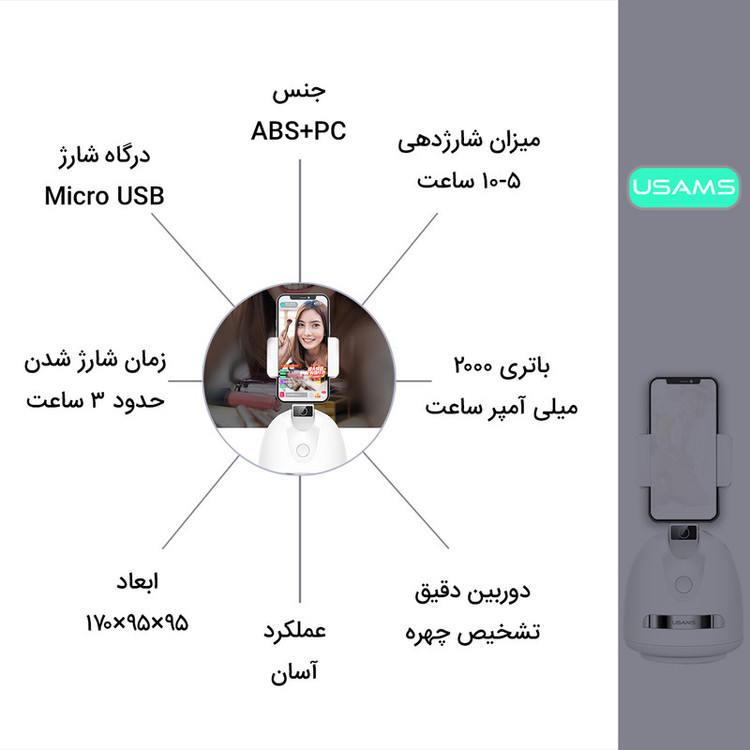سایر توضیحات: برند معتبر یوسمز - زمان شارژ شدن حدود 3 ساعت - درگاه شارژ Micro USB - باتری 2000 میلی آمپر ساعت - میزان شارژدهی بین 5 تا 10 ساعت - ساخته شده از جنس ABS + PC - دوربین دقیق تشخیص چهره - عملکرد آسان - قابلیت چرخش افقی و عمودی - مناسب برای انواع تلفن همراه