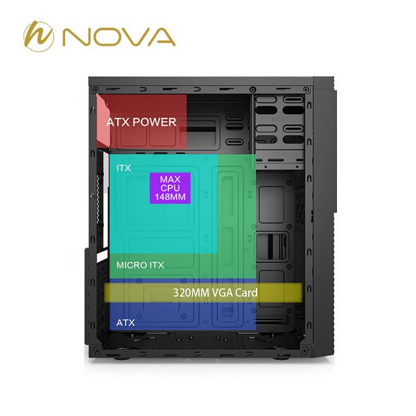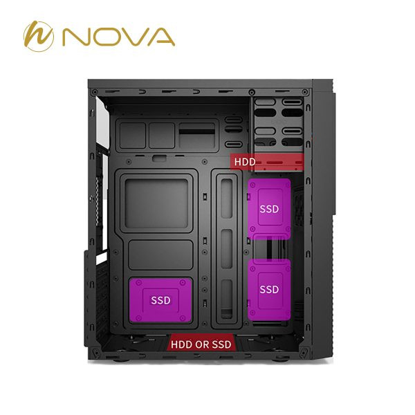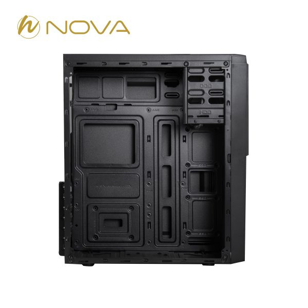 کیس Nova NC-E130 یکی از محصولات خوشساخت و اقتصادی برند نوا است که برای استفادههای اداری، خانگی و کاربری عمومی طراحی شده است. این کیس با ابعاد جمعوجور و طراحی ساده، امکان اسمبل یک سیستم کارآمد و کمهزینه را فراهم میکند. بدنه کیس از ورق مقاوم SPCC با ضخامت مناسب ساخته شده که استحکام قابل قبولی در برابر فشار و ضربه ارائه میدهد. فضای داخلی کیس بهگونهای طراحی شده تا بتواند از مادربردهای ATX، Micro-ATX و ITX پشتیبانی کند و نصب قطعات متداول اداری مانند هارد، SSD و کارت گرافیک را بهراحتی پوشش دهد. از نظر ذخیرهسازی، این کیس قابلیت نصب تا ۳ عدد SSD 2.5 اینچی و ۲ عدد HDD 3.5 اینچی را دارد که برای سیستمهای اداری و خانگی انتخابی ایدهآل است. همچنین امکان نصب کارت گرافیک تا طول ۳۲۰ میلیمتر و خنککننده پردازنده تا ارتفاع ۱۴۸ میلیمتر در آن وجود دارد. در بخش خنکسازی، کیس Nova NC-E130 بهصورت پیشفرض فاقد فن است، اما کاربران میتوانند تا ۴ عدد فن در قسمتهای جلو، عقب و کنارهها نصب کنند تا جریان هوای بهتری برای قطعات ایجاد شود.