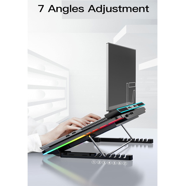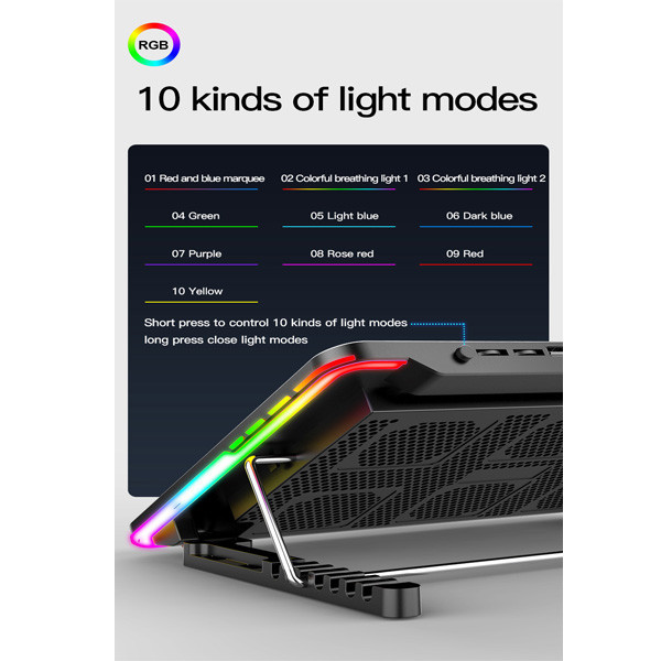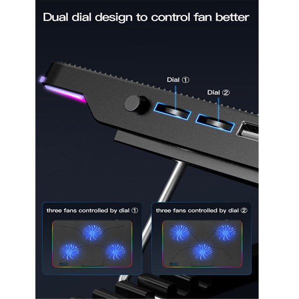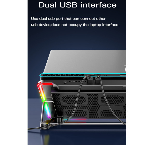 طراحی فوق العاده سال 2021 که توسط شرکت کول کلد طراحی گردیده و با قدرت خنک کنندگی 6 فن با دور 2600±10%RPM و رنگ آمیزی فوق العاده زیبا بهمراه LED های رنگی که در کناره های کول فن جای گرفته و همچنین پایه نگهدارنده گوشی موبایل ، باعث شده تا زیباترین و خاص ترین محصول 2021 را به ارمغان بیاورد. جنس بنده از پلاستیک با کیفیت ABS و فلز می باشد این کول پد دارای 2دکمه اسکرولی جهت کم و زیاد کردن سرعت فن ها و همچنین خاموش و روشن کردن تعداد فن ها و یک دکمه جهت تغییر رنگ نور LED ها می باشد که دارای 10 حالت نورانی می باشد و پایه قابل تنظیم در زیر کول پد و همچنین یک پایه در وسط و روی کول پد جهت ثابت نگه دارنده لپ تاپ در حالت شیبدار میباشد . این کول پد مناسب گیمرها ، طراحان گرافیک و معماری و ... می باشد .
