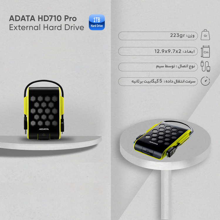 هارد اکسترنال HD720 محصول برند ای دیتا است. این هارد اکسترنال با یک روکش سیلیکونی پوشانده شده که از آن در برابر ضربه محافظت میکند. استفاده از پترن لانه زنبوری در روکش HD720 ظاهر زیبایی به آن داده است. این هارد هم در برابر ضربه مقاوم است و هم در برابر شوک و سقوط از ارتفاع مقاومت دارد.